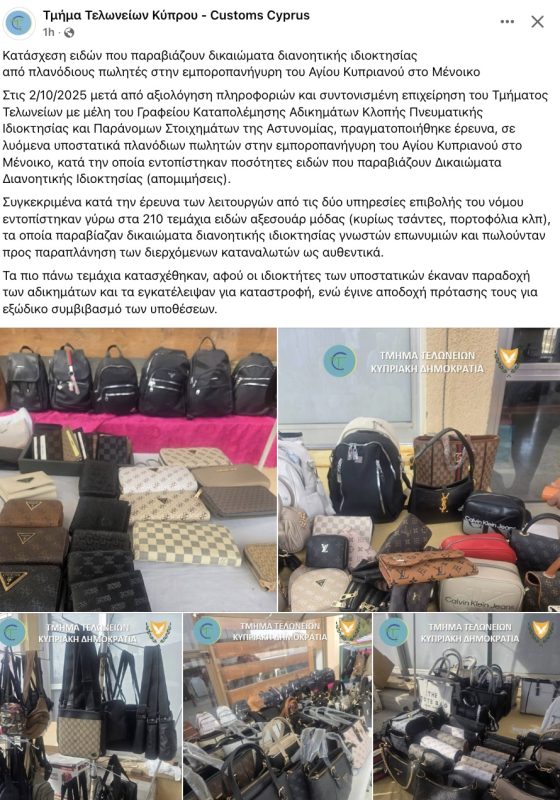 Στις 2/10/2025 μετά από αξιολόγηση πληροφοριών και συντονισμένη επιχείρηση του Τμήματος Τελωνείων με μέλη του Γραφείου Καταπολέμησης Αδικημάτων Κλοπής Πνευματικής Ιδιοκτησίας και Παράνομων Στοιχημάτων της Αστυνομίας, πραγματοποιήθηκε έρευνα, σε λυόμενα υποστατικά πλανόδιων πωλητών στην εμποροπανήγυρη του Αγίου Κυπριανού στο Μένοικο, κατά την οποία εντοπίστηκαν ποσότητες ειδών που παραβιάζουν Δικαιώματα Διανοητικής Ιδιοκτησίας (απομιμήσεις).