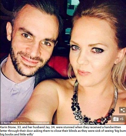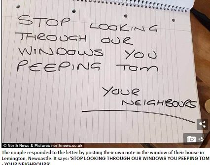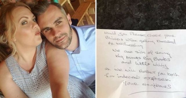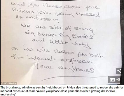 «Θα κλείσετε σας παρακαλώ τις κουρτίνες σας όταν ντύνεστε ή ξεντύνεστε; Έχουμε βαρεθεί να βλέπουμε μεγάλους πισινούς, μεγάλα στήθη και μικρά πέη και θα σας αναφέρουμε στην αστυνομία για άσεμνη περιβολή. Οι γείτονές σας», αυτό έγραφε το σημείωμα που δεν θα έμενε φυσικά χωρίς απάντηση, καθώς το ζευγάρι δεν χάρηκε ακριβώς για τα σχόλια των γειτόνων του.