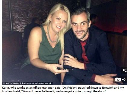Η 33χρονη Karin Stone και ο 34χρονος σύζυγός της Jay έφτασαν σπίτι τους μια μέρα στο Νιούκαστλ της Αγγλίας για να δουν το μήνυμα του «ανήσυχου» γείτονα που τα έβλεπε όλα.