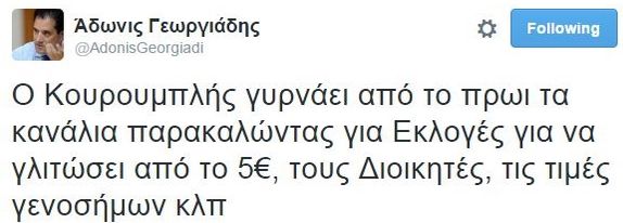 «Ο Κουρουμπλής γυρνάει από το πρωί τα κανάλια παρακαλώντας για Εκλογές για να γλιτώσει από το 5€, τους Διοικητές, τις τιμές γενοσήμων κλπ», γράφει χαρακτηριστικά.