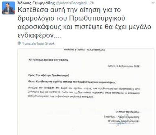 Με αίτησή του προς τον πρωθυπουργό, Αλέξη Τσίπρα, ο Άδωνις Γεωργιάδης ζητά να κατατεθεί στο Σώμα το σχέδιο πτήσης του πρωθυπουργικό αεροσκάφος, για το διάστημα από τις 27 έως τις 30 Ιανουαρίου.