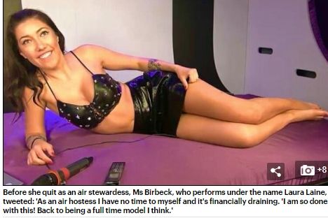 Το καλλιτεχνικό της όνομα είναι Laura Laine και κάνει ζωντανά στριπ σόου. Μία πρώην συνάδελφός της είπε, ότι δεν ξαφνιάστηκε με την επιλογή της, γιατί αυτό ήταν που την ενδιέφερε να κάνει πάντα. «Συνεργαζόμασταν πέρυσι και μου είπε ότι έπαιρνε μαζί της μια κάμερα web και ένα φορητό υπολογιστή σε κάθε πτήση.