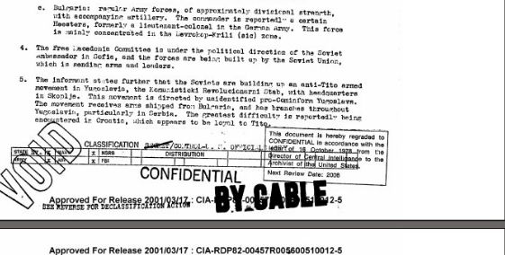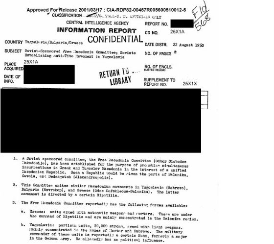 Το σημείωμα της CIA, το οποίο δημοσίευσαν αρκετά ΜΜΕ στην ΠΓΔΜ, που είχε συνταχθεί το 1950, κάνει λόγο για μία «σοβιετικά χορηγούμενη επιτροπή», με σκοπό εξεγέρσεις που θα δημιουργούσαν μία «ενοποιημένη Δημοκρατία της Μακεδονίας».