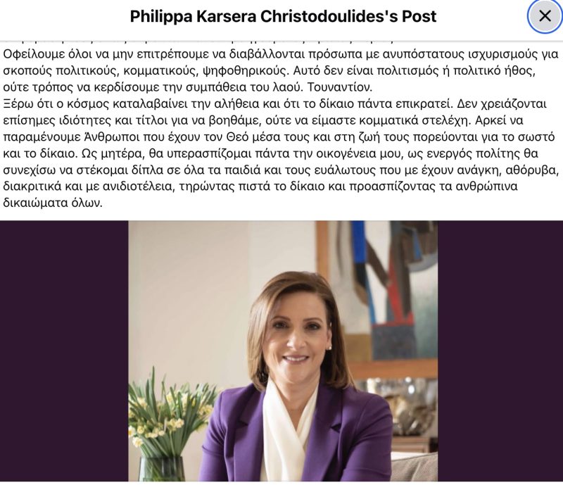 Υπάρχει επίσης ο κίνδυνος περαιτέρω διάχυσης και αβασάνιστης μαζικής αναπαραγωγής των κακοηθειών και ανυπόστατων ισχυρισμών κάτι που θα αποτελεί δυσφήμιση και παραβίαση ανθρωπίνων δικαιωμάτων δικών μου και της οικογένειας μου. Το ότι είμαι σύζυγος του Προέδρου της Κυπριακής Δημοκρατίας δεν αποτελεί δικαιολογία ή ελαφρυντικό για αυτές τις ανυπόστατες επιθέσεις και κατηγορίες.