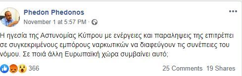 Η δημοσίευση του κ. Φαίδωνος έγινε την 1η Νοεμβρίου του 2019 στον προσωπικό στο λογαριασμό στο facebook, σύμφωνα με την οποία “με βάση πρόσφατο περιστατικό, η ηγεσία της Αστυνομίας Κύπρου με ενέργειες και παραλήψεις της επιτρέπει σε συγκεκριμένους εμπόρους ναρκωτικών να διαφεύγουν τις συνέπειες του νόμου. Σε ποια άλλη ευρωπαϊκή χώρα συμβαίνει αυτό;”.