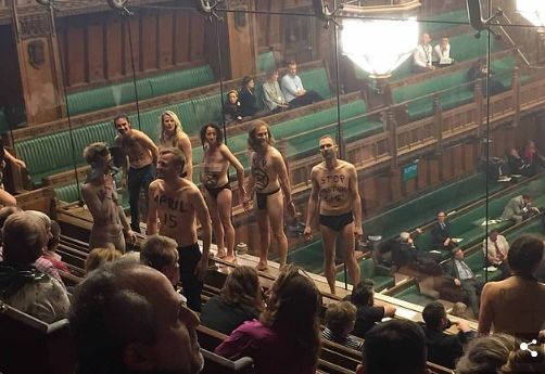 Ενώ οι βουλευτές είχαν ξεκινήσει άλλη μια ημέρα συζητήσεων για το πώς ή ακόμη και το αν η χώρα θα πρέπει να αποχωρήσει από την Ευρωπαϊκή Ένωση, περί τους 10 διαδηλωτές γδύθηκαν, κατεβάζοντας τα παντελόνια τους κι έχοντας ζωγραφίσει στους γλουτούς τους συνθήματα όπως: «Κλιματική Δικαιοσύνη τώρα».