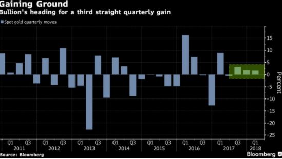 Τα επίπεδα διαπραγμάτευσης ήταν σταθερά στα $ 1.323,92 στις 7:54 μ.μ. στο Λονδίνο, αυξημένα κατά 1,6% αυτό το τρίμηνο, σύμφωνα με τη γενική ανασκόπηση των τιμών, που κάνει το Bloomberg. Αυτό αποτελεί συνέχεια της παρόμοιας αύξησης κατά τους τελευταίους τρεις μήνες του περασμένου έτους και το 3,1% που ανέβηκε στο τρίτο τρίμηνο του 2017, με την άνοδο να έρχεται ακόμη και όταν η Ομοσπονδιακή Τράπεζα των ΗΠΑ έχει «τραβήξει τη σκανδάλη» στα επιτόκια των ΗΠΑ.