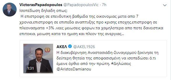 Κατ’ αρχάς καλωσορίζουμε τον κ. Βίκτωρα Παπαδόπουλο, στον οποίο προφανώς και πάλι ανατέθηκε το καθήκον να απαντά στο ΑΚΕΛ. Θα συνιστούσαμε λιγότερο πανηγυρική διάθεση για τη «μείωση της ανεργίας» αν ήμασταν στη θέση του, αλλά και γενικότερα για τις οικονομικές επιδόσεις της κυβέρνησης Αναστασιάδη – Συναγερμού.