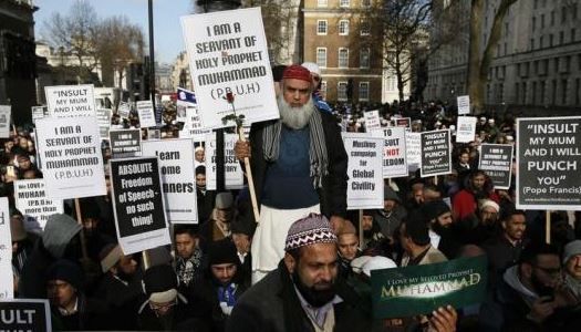 Τουλάχιστον 1.000 Βρετανοί Μουσουλμάνοι διαδήλωσαν την Κυριακή στο κέντρο του Λονδίνου ενάντια σε αυτό που αποκαλούν «προσβλητική απεικόνιση» του προφήτη Μωάμεθ από τη γαλλική εφημερίδα Charlie Hebdo. Το πλήθος των Μουσουλμάνων συγκεντρώθηκε κοντά στο γραφείο του πρωθυπουργού Ντέιβιντ Κάμερον κρατώντας πλακάτ με συνθήματα όπως « Ξεσηκωθείτε για τον Προφήτη».
