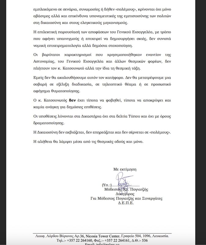 Αυτούσια η ανακοίνωση του δικηγόρου Μόδεστου Πογιατζή, νομικού εκπροσώπου του κ. Κατσουνωτού