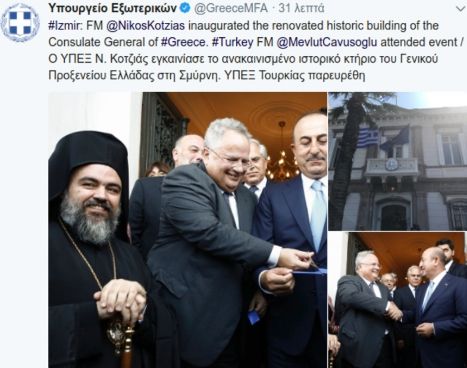 Ο υπουργός Εξωτερικών, Νίκος Κοτζιάς, μετέβη στη Σμύρνη, προκειμένου να παραστεί στην τελετή επανεγκατάστασης του Γενικού Προξενείου της Ελλάδας στο ανακαινισμένο ιδιόκτητο κτήριο Καπετανάκη. Εκεί είχε κατ’ ιδίαν συνάντηση με τον Τούρκο ομόλογό του, Μεβλούτ Τσαβούσογλου, ο οποίος επίσης παρέστη στην τελετή.