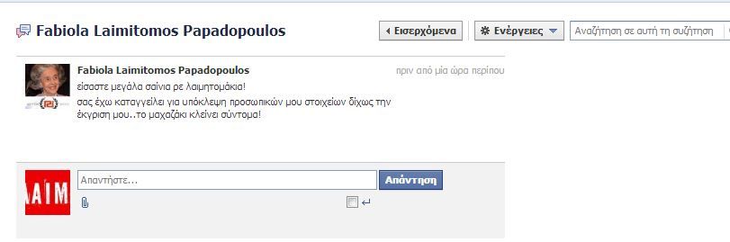 Eδώ και αρκετό καιρό κάποιοι “κύριοι – κύριες” χρησιμοποιούν το όνομα της διαδικτυακής μας εφημερίδας LAIMITOMOS.COM και σχολιάζουν και βρίζουν συναδέλφους, δημοσιογράφους, πολιτικούς και φίλους, χρησιμοποιώντας το ψευδώνυμο Faviola Laimitomos Papadopoulos μέσω των σελίδων κοινωνικής δικτύωσης facebook.