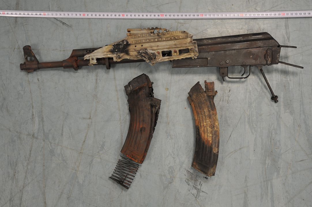 τρία πολεμικά τυφέκια, τύπου Kalashnikov (το ένα φέρει εμφανή σημάδια-φθορές από πυρκαγιά που έβαλε ο δράστης στο όχημα τύπου «κλούβα» που προσομοίαζε με ασθενοφόρο)