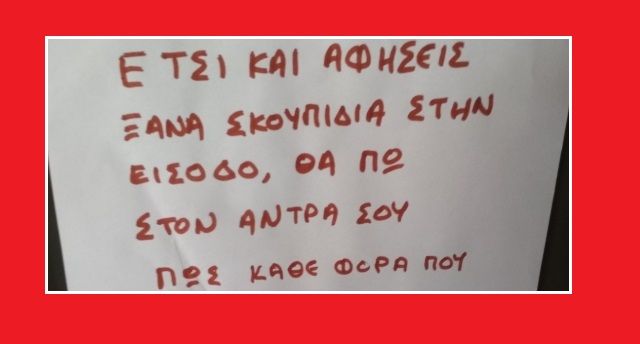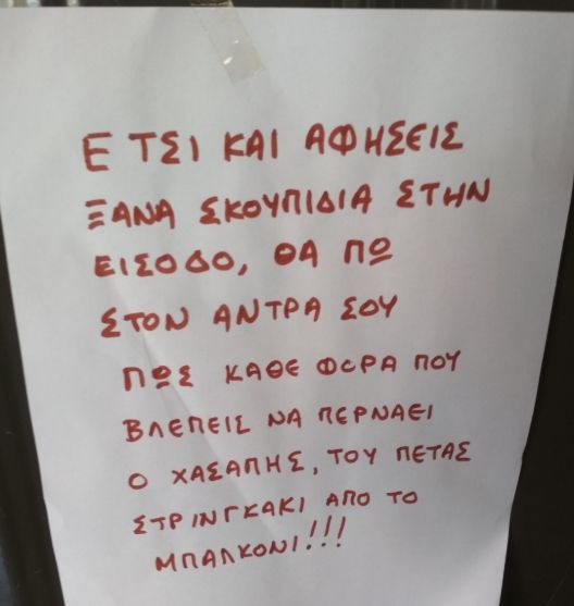 Αυτό έγραφε: «Έτσι και αφήσεις ξανά τα σκουπίδια στην είσοδο, θα πω στον άνδρα σου πως κάθε φορά που βλέπεις να περνάει ο χασάπης του πετάς στρινγκάκι από το μπαλκόνι».