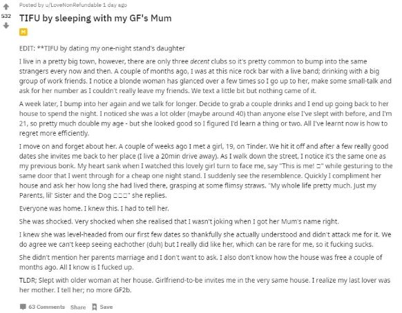 Προχώρησα παρακάτω και την ξέχασα. Πριν από μερικές εβδομάδες γνώρισα μία κοπέλα στο Tinder. Τα βρήκαμε και μετά από μερικά ωραία ραντεβού με κάλεσε στο σπίτι (μένω 20 λεπτά μακριά με το αυτοκίνητο). Καθώς πηγαίναμε εκεί, διαπίστωσα οτι ήταν στον ίδιο με εκείνη την γυναίκα. Η καρδιά μου σταμάτησε όταν την άκουσα να λέει «εδώ είναι», δείχνοντάς μου την πόρτα που πέρασα για εκείνο το φθηνό one night stand. Αμέσως την ρώτησα πόσο καιρό μένει εκεί και εκείνη μου απάντησε: «Όλη μου την ζωή. Εγώ οι γονείς μου, η μικρή μου αδελφή και ο σκύλος».