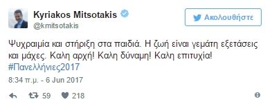 Το δικό του μήνυμα στήριξης προς τους υποψήφιους των Πανελλαδικών εξετάσεων έστειλε ο πρόεδρος της Νέας Δημοκρατίας, Κυριάκος Μητσοτάκης.