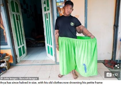 Το 13χρονο αγόρι που κάποτε ζύγιζε 192 κιλά και θεωρείτο το πιο παχύ αγόρι στον κόσμο, έχασε όλο το περιττό βάρος αλλά του έμεινε το… περιττό δέρμα. Ο Άρια Περμάνα από την Ινδονησία έτρωγε διαρκώς νουντλς, ανθρακούχα αναψυκτικά και τηγανητό κοτόπουλο με αποτέλεσμα να φθάσει να ζυγίζει σχεδόν 200 κιλά.