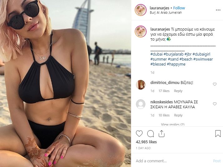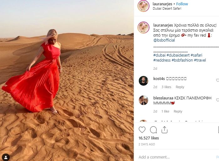 Ξένοιαστες στιγμές στο Ντουμπάι πέρασε το Πάσχα η Λάουρα Νάργες. Η παρουσιάστρια ενθουσιάστηκε από τη διαμονή της στα Ηνωμένα Αραβικά Εμιράτα και μάλιστα διατύπωσε μέσω social media την επιθυμία της να επισκέπτεται το Ντουμπάι κάθε μήνα. Οι περιπλανήσεις της περιλάμβαναν κολύμπι στη θάλασσα, σαφάρι στην έρημο και φυσικά τις απαραίτητες αναφορές στον χορηγό της.