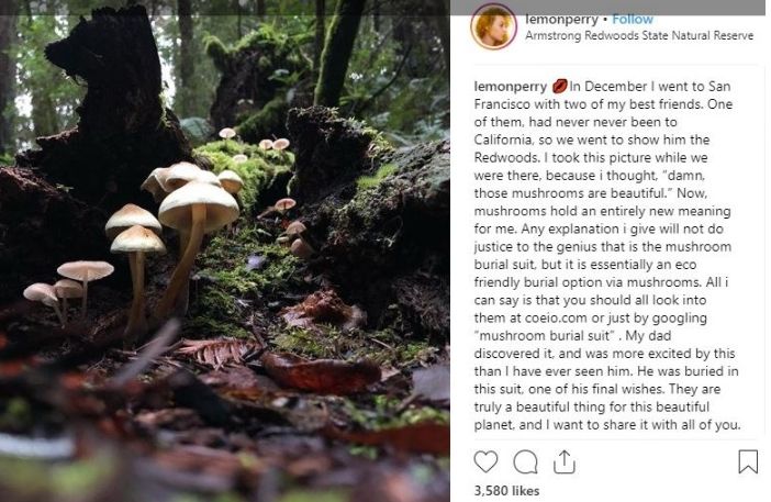 “Τον Δεκέμβριο πήγα στο Σαν Φρανσίσκο με δύο καλούς μου φίλους. Ένας εξ αυτών δεν είχε επισκεφθεί ποτέ την Καλιφόρνια, έτσι επισκεφθήκαμε το Redwoods. Τράβηξα αυτή τη φωτογραφία κατά τη διάρκεια της επίσκεψής μας, γιατί σκέφτηκα ‘αυτά τα μανιτάρια είναι πανέμορφα’. Τώρα τα μανιτάρια έχουν πια ένα εντελώς νέο νόημα για εμένα. Όποια εξήγηση κι αν δώσω, δεν θα είναι αρκετή για να περιγράψω την ευφυΐα πίσω από το κοστούμι ταφής από μανιτάρια, αλλά ουσιαστικά είναι μία φιλική προς το περιβάλλον επιλογή ταφής μέσω των μανιταριών. Όταν ο πατέρας μου το ανακάλυψε, ήταν τόσο ενθουσιασμένος όσο ποτέ. Τον θάψαμε με αυτό το κοστούμι, ήταν μία από τις τελευταίες του επιθυμίες. Είναι αληθινά ένα όμορφο πράγμα για αυτόν τον πανέμορφο πλανήτη και ήθελα να το μοιραστώ με όλους σας” έγραψε η Σόφι Πέρι.