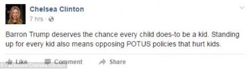 «Ο Μπάρον Τραμπ αξίζει την ευκαιρία, όπως κάθε παιδί, να είναι παιδί. Το να υπερασπίζεσαι τα παιδιά σημαίνει επίσης τον να αντιστέκεσαι σε κάθε πολιτική του Προέδρου των ΗΠΑ που βλάπτει τα παιδιά», έγραψε η Τσέλσι Κλίντον.