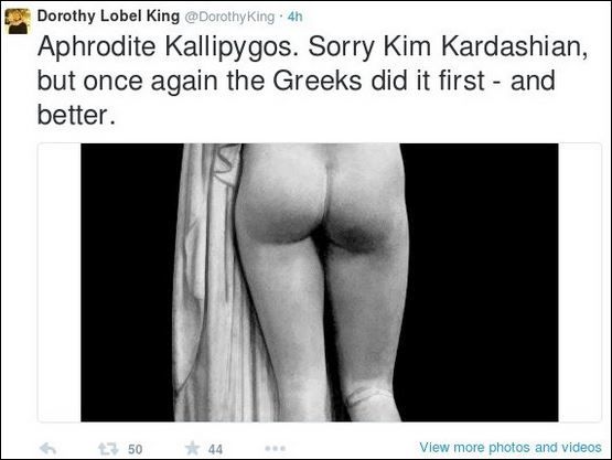 Με αυτό τον τρόπο η Ντόροθι Κινγκ σχολίασε τη… μανία της Καρντάσιαν με τα οπίσθιά της, τα οποία συζητούνται ξανά έντονα τις τελευταίες ημέρες. Η Αφροδίτη Καλλίπυγος θεωρείται το πιο τολμηρό αρχαιοελληνικό άγαλμα και αντίγραφά του βρίσκονται σε ιδιωτικές συλλογές, μουσεία και δημόσιους χώρους. Απεικονίζει τη θεά του έρωτα με ανασηκωμένο το μανδύα της, να ρίχνει το βλέμμα πίσω από την ωμοπλάτη της προς τους δύο ξεσκέπαστους γλουτούς της.