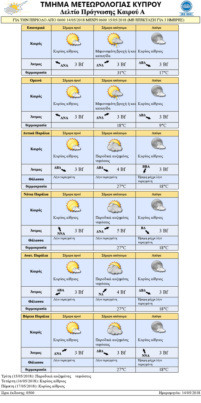 Απόψε ο καιρός θα καταστεί σύντομα κυρίως αίθριος. Τοπικά πιθανό να σχηματιστεί χαμηλή νέφωση ή και αραιή ομίχλη. Οι άνεμοι θα πνέουν κυρίως βορειοδυτικοί ως βορειοανατολικοί ασθενείς, 3 μποφόρ. Η θάλασσα θα είναι ήρεμη μέχρι λίγο ταραγμένη. Η θερμοκρασία θα πέσει στους 17 βαθμούς στο εσωτερικό, γύρω στους 18 στα παράλια και στους 9 βαθμούς στα ψηλότερα ορεινά.