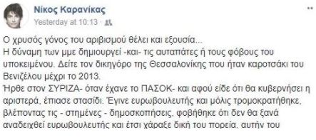 Πιο συγκεκριμένα το κείμενο που «ανέβασε» ο Νίκος Καρανίκας στο facebook: «Ο χρυσός γόνος του αριβισμού θέλει και εξουσία… Η δύναμη των μμε δημιουργεί -και- τις αυταπάτες ή τους φόβους του υποκειμένου. Δείτε τον δικηγόρο της Θεσσαλονίκης που ήταν καροτσάκι του Βενιζέλου μέχρι το 2013.