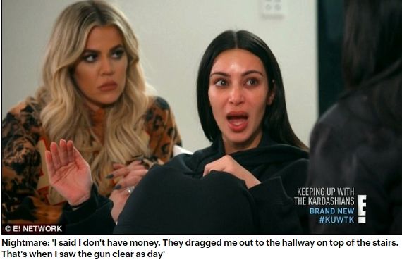 Πριν τη φιμώσουν η Κιμ Καρντάσιαν μιλούσε με τον θυρωρό που είχε αναγκάσει να τους πάει στο δωμάτιό της: “Θα πεθάνουμε; Δεν μπορούν να με καταλάβουν αλλά σε παρακαλώ πες τους ότι έχω παιδιά, έχω οικογένεια, αφήστε με να ζήσω. Τους είπα ότι δεν έχω χρήματα. Με έσυραν στον διάδρομο. Κοίταζα το όπλο και σκεφτόμουν ότι δεν υπάρχει τρόπος διαφυγής”. Όταν τελείωσε η ληστεία, η Κιμ Καρντάσιαν κρύφτηκε σε ένα θάμνο στο μπαλκόνι. “Ήταν πολύ δύσκολο για εμένα όταν έφτασε η αστυνομία γιατί φορούσαν τις ίδιες στολές με τους κλέφτες εκτός από τις μάσκες”.