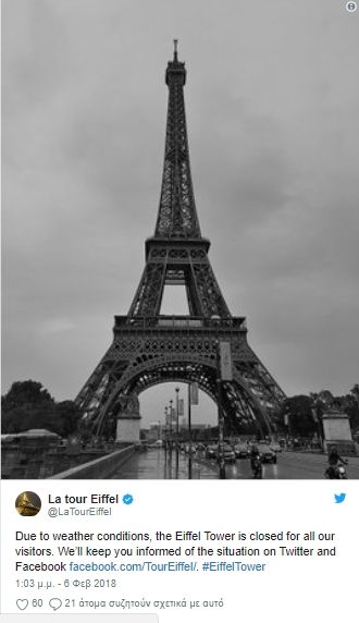 «Εξαιτίας των μετεωρολογικών συνθηκών, ο πύργος του Άιφελ έκλεισε για όλους τους επισκέπτες μας», ανακοίνωσε μέσω του Twitter η εταιρεία που εκμεταλλεύεται το διάσημο μνημείο, ενώ το Παρίσι και τα γύρω προάστιά του έχουν τεθεί από τη γαλλική μετεωρολογική υπηρεσία σε «πορτοκαλί επιφυλακή».