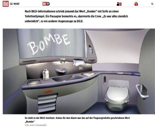 Ο εικονογράφος της Bild, έφτιαξε μία φωτογραφία, παρουσιάζοντας πώς ήταν το μήνυμα στην τουαλέτα του αεροσκάφους, το οποίο σκόρπισε τον τρόμο. Μάλιστα, όπως αναφέρουν οι επιβάτες, το μήνυμα «bombe», ήταν γραμμένο με σαπούνι στον καθρέφτη του μπάνιου.