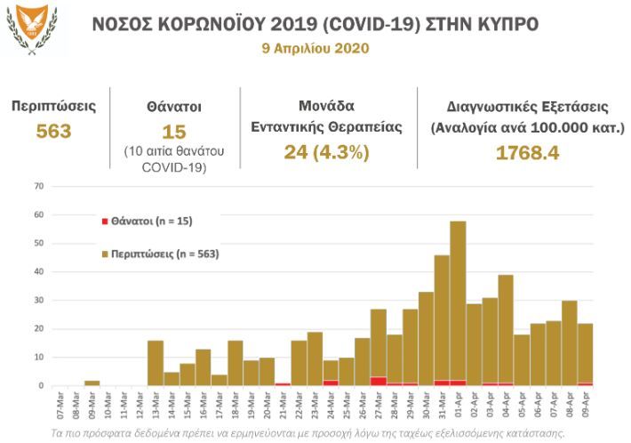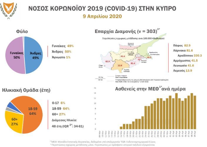 Να αναφέρουμε επίσης ότι τα 616 περιστατικά COVID-19 εντοπίστηκαν μετά τη διεκπεραίωση συνολικά 17,119 εργαστηριακών αναλύσεων από το Ινστιτούτο Νευρολογίας και Γενετικής Κύπρου και τα Μικροβιολογικά Τμήματα των νοσηλευτηρίων του ΟΚΥπΥ και από ιδιωτικά εργαστήρια.