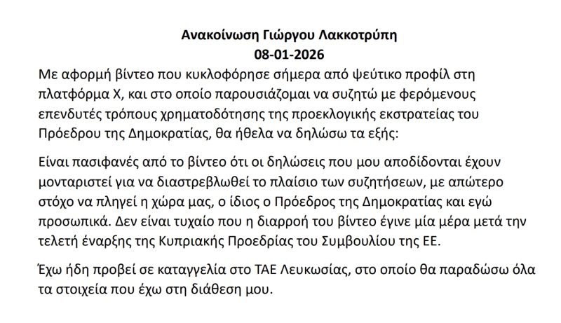 Με αφορμή βίντεο που κυκλοφόρησε σήμερα από ψεύτικο προφίλ στη πλατφόρμα X, και στο οποίο παρουσιάζομαι να συζητώ με φερόμενους επενδυτές τρόπους χρηματοδότησης της προεκλογικής εκστρατείας του Πρόεδρου της Δημοκρατίας, θα ήθελα να δηλώσω τα εξής: