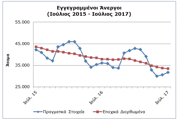 Σε σύγκριση με τον Ιούλιο 2016 σημειώθηκε μείωση 4.442 προσώπων ή 12,3% που αποδίδεται κυρίως στους τομείς των κατασκευών (μείωση 1.103 ανέργων), της δημόσιας διοίκησης (μείωση 1.006), του εμπορίου (μείωση 725), της μεταποίησης (μείωση 488) και των χρηματοπιστωτικών και ασφαλιστικών δραστηριοτήτων (μείωση 327).
