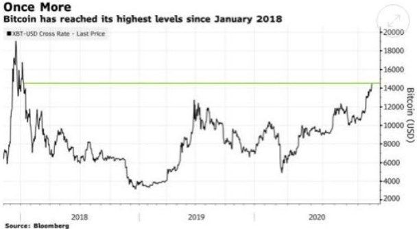Μπορεί να ευθύνεται η αβεβαιότητα για τις προεδρικές εκλογές στις ΗΠΑ, οι μελλοντικές εξελίξεις με την πανδημία ή απλά το αυξημένο ενδιαφέρον των επενδυτών, αλλά γεγονός είναι ότι το bitcoin βρίσκεται σε τροχιά ισχυρής ανόδου, καθώς φλερτάρει με τα υψηλότερα επίπεδα από τον Ιανουάριο του 2018. Σήμερα το πρωί στο χρηματιστήριο του Λονδίνου το δημοφιλέστερο κρυπτονόμισμα σημείωνε άνοδο 3,3% στα 14.463 δολάρια.