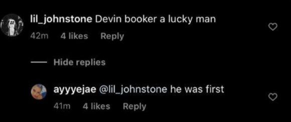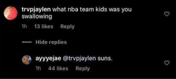 Λίγο αργότερα απάντησε σε ένα χρήστη του Instagram, πως η ομάδα αυτή ήταν οι Suns – οι οποίοι ήταν αήττητοι στην «φούσκα» του ΝΒΑ – ενώ πιο μετά κάποιος τη ρώτησε αν ο Ντέβιν Μπούκερ ήταν τυχερός και εκείνη είπε «Ήταν πρώτος».