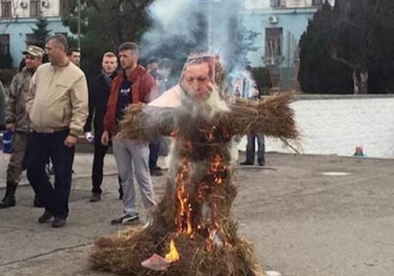Στην Κριμαία, μια ομάδα νεαρών έκαψε σήμερα ένα ομοίωμα του Ρετζέπ Ταγίπ Ερντογάν στην κεντρική πλατεία της Συμφερόπολης, μετέδωσαν τοπικά μέσα ενημέρωσης.