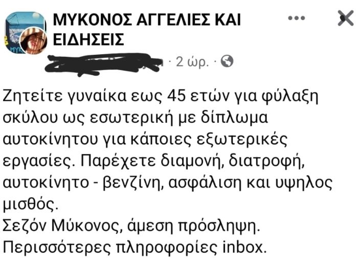 Παράδειγμα η αγγελία που αναρτήθηκε χθες το πρωί και αφορούσε σε… φύλαξη σκύλου. Ο μεσάζοντας που ανήρτησε την αγγελία για λογαριασμό του ιδιοκτήτη του σκύλου, ανέφερε ότι ζητείται γυναίκα έως 45 ετών για φύλαξη σκύλου ως εσωτερική με δίπλωμα αυτοκινήτου για κάποιες εξωτερικές εργασίες και ότι παρέχετε διαμονή, διατροφή, αυτοκίνητο-βενζίνη, ασφάλιση και υψηλός μισθός.