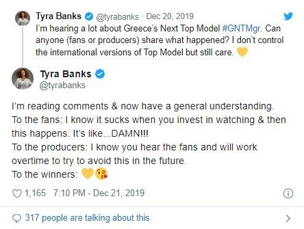 «Διαβάζω τα σχόλια και τώρα έχω μια γενικότερη εικόνα. Προς τους τηλεθεατές: Ξέρω ότι είναι κρίμα να επενδύεις σε ένα πρόγραμμα και να συμβαίνει κάτι τέτοιο. Είναι σαν… κατάρα! Προς τους παραγωγούς: Ξέρω ότι θα λάβετε υπόψιν σας τα σχόλια των φανς και θα δουλέψετε αρκετά ώστε να αποφύγετε κάτι παρόμοιο στο μέλλον. Προς τις νικήτριες: 💛» έγραψε στο Twitter.
