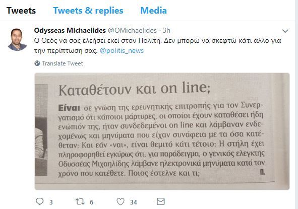 Σε σημερινή του ανάρτηση στο Tweeter ο Οδυσσέας πόσταρε απόκομμα της εφημερίδας “Πολίτης”, στο οποίο ανέφερε ότι ο Γενικός Ελεγκτής, λάμβανε ηλεκτρονικά μηνύματα κατά τον χρόνο που κατέθετε ενώπιον της ερευνητικής επιτροπής.