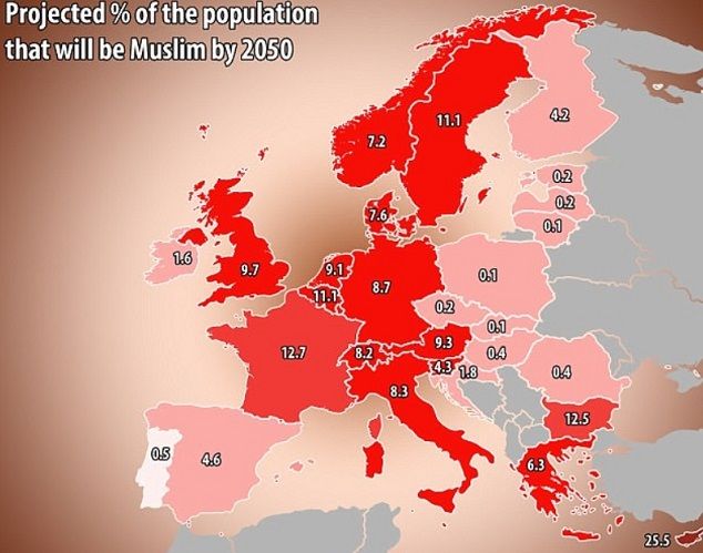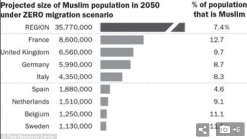 Το ποσοστό των μουσουλμάνων στον ευρωπαϊκό πληθυσμό μπορεί να φθάσει από το 7,4% έως το 14% έως το 2050, έναντι 4,9% το 2016, σύμφωνα με έρευνα του ινστιτούτου Pew που δημοσιοποιήθηκε σήμερα και διενεργήθηκε στη βάση τριών σεναρίων μετανάστευσης: μηδενική, μεσαία και ισχυρή.