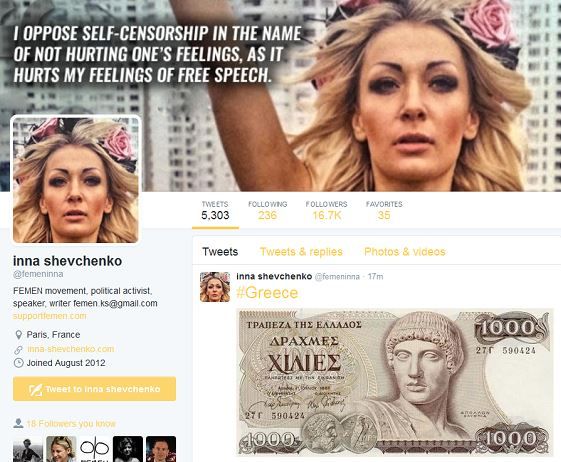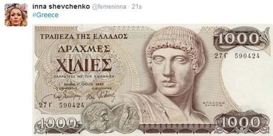 Σύμφωνα με ανάρτηση της επικεφαλής των γυμνόστηθων ακτιβιστριών Femen, η Ίνα Σεβτσένκο, υποδέχθηκε το υψηλό ποσοστό του «όχι» με μία φωτογραφία ενός χαρτονομίσματος 1.000 δραχμών.