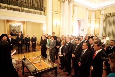 Ολοκληρώθηκε η τελετή ορκωμοσίας του νέου Υπουργικό Συμβουλίου η οποία πραγματοποιήθηκε στο Προεδρικό Μέγαρο χοροστατούντος του αρχιεπίσκοπου Ιερώνυμου και παρουσία του Προέδρου της Δημοκρατίας Κάρολου Παπούλια και του Πρωθυπουργού Αντώνη Σαμαρά.