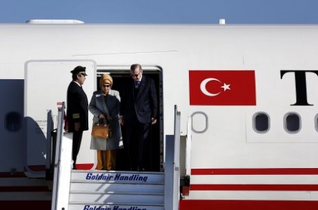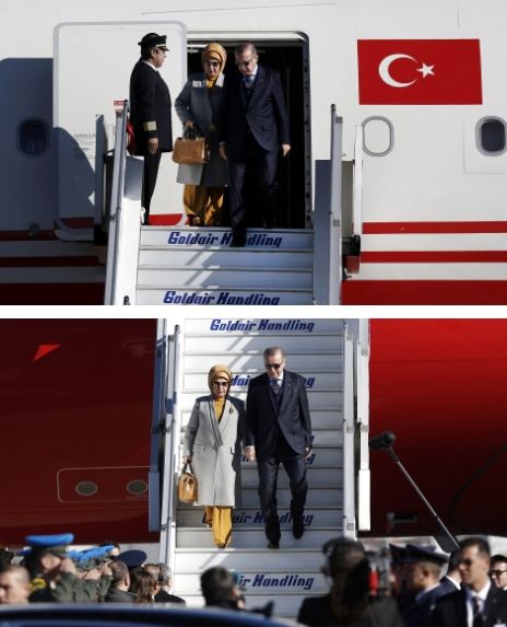 Ο Πρόεδρος της Τουρκίας Ρετζέπ Ταγίπ Ερντογάν και η σύζυγος του Εμινέ Ερντογάν κατέβηκαν από το αεροσκάφος πιασμένοι χέρι με χέρι.