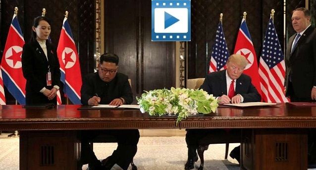 Νωρίτερα, καθώς ο Τραμπ κάθισε στο τραπέζι και υπέγραψε μαζί με τον Κιμ τα σχετικά έγγραφα, χωρίς να αποκαλύπτει το περιεχόμενό τους είπε: «Υπογράφουμε ένα πολύ σημαντικό έγγραφο, ένα πολύ περιεκτικό έγγραφο.»