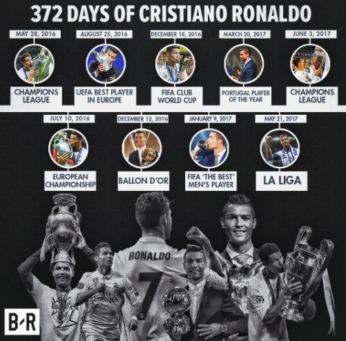 Ο Κριστιάνο τον τελευταίο χρόνο και… κάτι (372 ημέρες συγκεκριμένα) έχει σηκώσει, ότι… σηκώνεται. Ο Πορτογάλος σούπερ σταρ έχει καταφέρει να γεμίσει την τροπαιοθήκη του με πολλούς σπουδαίους τίτλους.