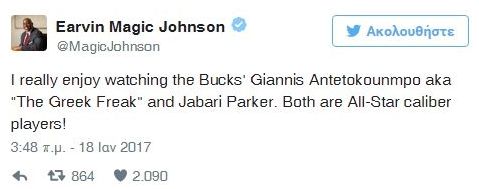 Ο άλλοτε αστέρας του ΝΒΑ και των Λέικερς, Μάτζικ Τζόνσον δεν δίστασε μέσω του προσωπικού του λογαριασμού στο twitter να αναφερθεί με τα καλύτερα λόγια στον Αντετοκούνμπο αλλά και στον Τζαμπάρι Πάρκερ.