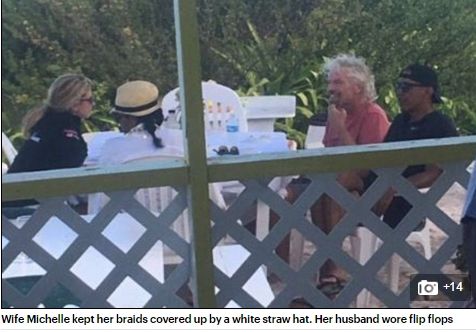 Ο φακός της Daily Mail συνέλαβε τον Μπάρακ Ομπάμα να χαλαρώνει χθες το μεσημέρι μαζί με τον Μπράνσον. Στην παρέα των δύο αντρών ήταν και η Μισέλ, η πρώην Πρώτη Κυρία των ΗΠΑ, και φίλοι. Ο πρόεδρος των ΗΠΑ φορούσε μαύρο τζόκεϊ καπέλο και και τα αγαπημένα του μαύρα γυαλιά ηλίου.