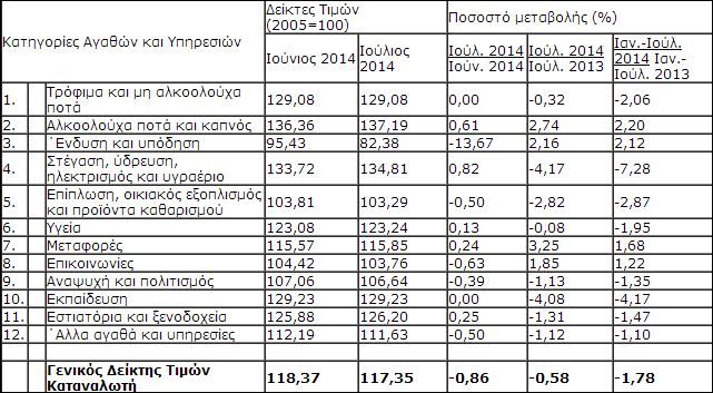 Ποιο συγκεκριμένα Δείκτης Τιμών Καταναλωτή τον Ιούλιο μειώθηκε κατά 1,02 μονάδες ή 0,86% και έφτασε στις 117,35 μονάδες σε σύγκριση με 118,37 τον Ιούνιο 2014.