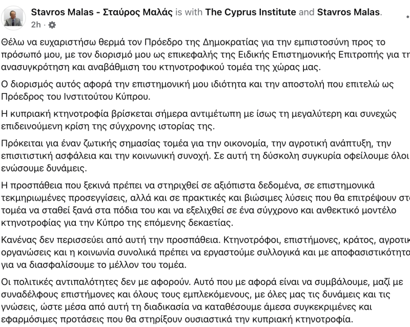 Ο Πρόεδρος της Δημοκρατίας διόρισε τον Σταύρο Μαλά Επικεφαλής της Ειδικής Επιστημονικής Επιτροπής για την ανασυγκρότηση και αναβάθμιση του κτηνοτροφικού τομέα. Στην Επιτροπή θα συμμετέχουν επίσης επιστήμονες, κτηνοτρόφοι, εκπρόσωποι του Υπουργείου Γεωργίας, του Υπουργείου Εσωτερικών και φυσικά των άμεσα ενδιαφερομένων, των αγροτικών οργανώσεων.