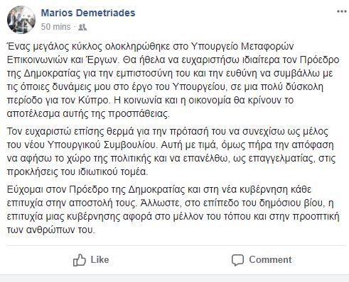 Ο Υπουργός Μεταφορών, Επικονωνιών και Έργων, Μάριος Δημητριάδης, με ανάρτηση του στο προσωπικό του λογαριαμό στο facebook, ευχαριστει τον Πρόεδρο της Δημοκρατίας για την πρόταση του να συνεχίσει στο νέο Υπουργικό σχήμα αλλά όπως αναφέρει αποφάσισε να αφήσει το χώρο της πολιτικής: